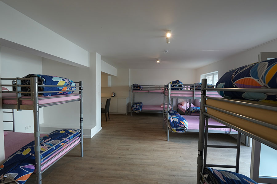 Le dortoir comprend une salle de bain partagée avec douche et sèche-cheveux. Il compte 12 lits superposés pour un séjour convivial et économique. Superficie : 75 m².